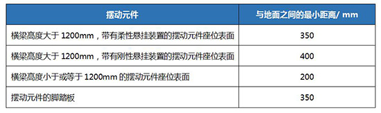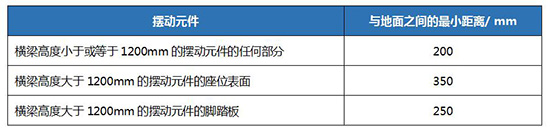 横梁高度大于1200mm的摆件元件中脚踏板250mm的离地间距,可为14岁以下儿童俯卧在地面时提供安全间隙。根据针对儿童身体特征的研究结果,通常95%的13岁儿童的胸部厚度为221mm,95%的13岁儿童的头部尺寸(从前额到后脑的距离)为198mm。