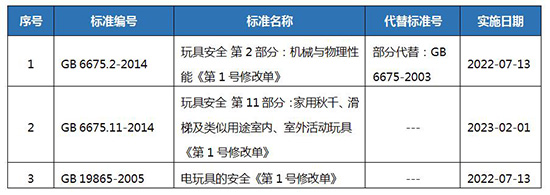 国家玩具安全标准GB 6675.2-2014、GB 6675.11-2014、GB 19865-2005在实施过程中发现个别条款存在出版印刷错误、编辑性错误,或描述不清晰;还有受采用早期国际标准版本的影响,个别条款较为落后,为妥善解决实施这些标准执行过程中存在的主要问题,国家市场监督管理总局(国家标准化管理委员会)于2022年7月13日发布2022年第9号公告,批准了这三项国家标准第1号修改单。