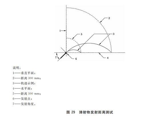 以任何正常可预见的方式发射弹射物,采用能达到最大飞行距离的发射角度(通常是45°)。在发射点,弹射物脱离发射机构并进入自由飞行。测量弹射物从发射点开始在空中飞行的最大距离。见图29。