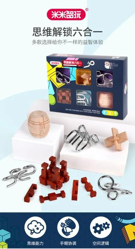 浙江金马工艺品有限公司旗下品牌“米米智玩”专注于智力玩具领域,已推出了多款传统玩具产品,包括3D鲁班锁、智力机关扣等组合装、思维解锁六合一等,其中思维解锁六合一销量较好。