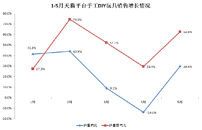从天猫平台销售情况来看,手工DIY玩具今年以来销售额呈现持续增长趋势,1-5月各月同比去年同期均有两位数增长,其中,2月份表现最佳,销售额同比增长74.3%。销量方面,除4月同比有所下降,其余月份也都实现了较大幅度的增长。