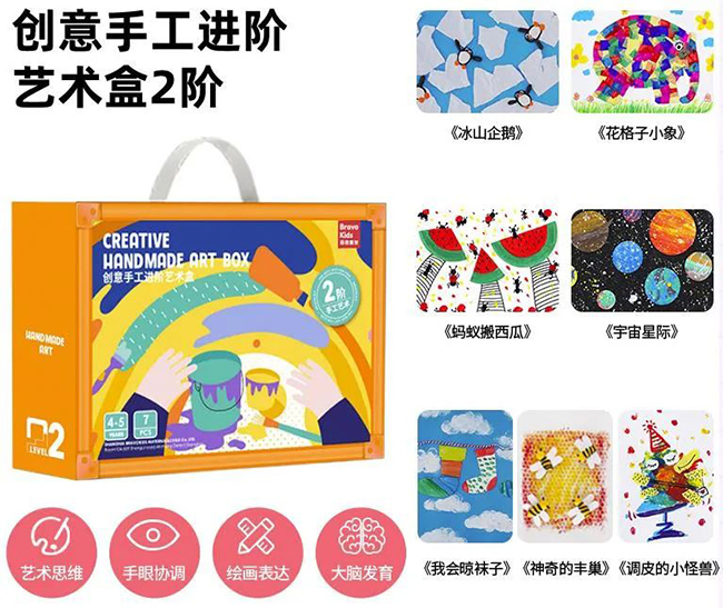 创意手工材料包类玩具从简到繁提供多个手工DIY项目,并配备丰富的辅助材料和视频化操作说明,融合剪纸、折纸、绘画、捏塑、上色等多种技能,多元化的项目内容和不同的操作手法,让儿童掌握多种手工技能,还能从中获得艺术启蒙或认知提升。
