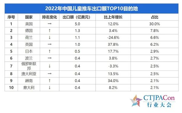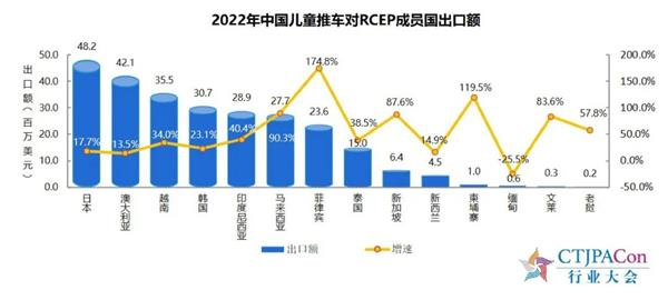 2022年,中国儿童推车出口额为16.7亿美元,比上年增长12.5%;中国儿童推车第一出口目的地为美国,出口额比上年增长12.0%;中国儿童推车对RCEP成员国出口额为2.7亿美元,比上年增长37.2%。