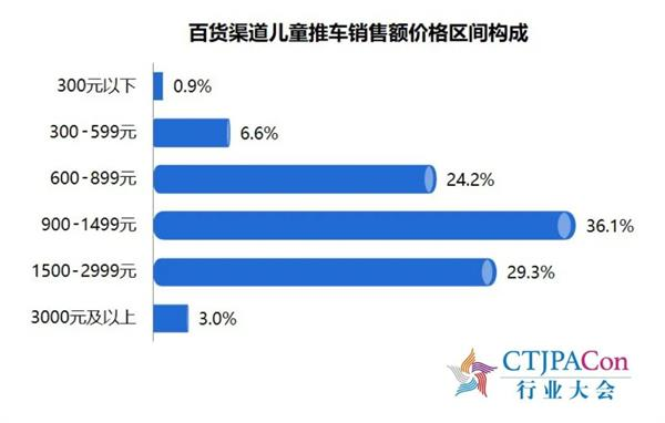 百货渠道,儿童推车价格区间在900-1499元的产品销售额占比最高,为36.1%。