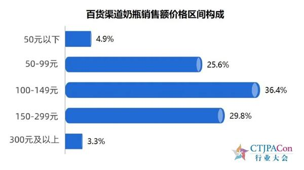 百货渠道,奶瓶价格区间在100-149元的产品销售额占比最高,为36.4%。