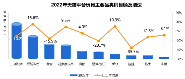 玩具品类,毛绒布艺玩具销售额比上年增幅最大,为15.6%。