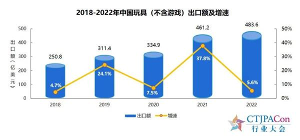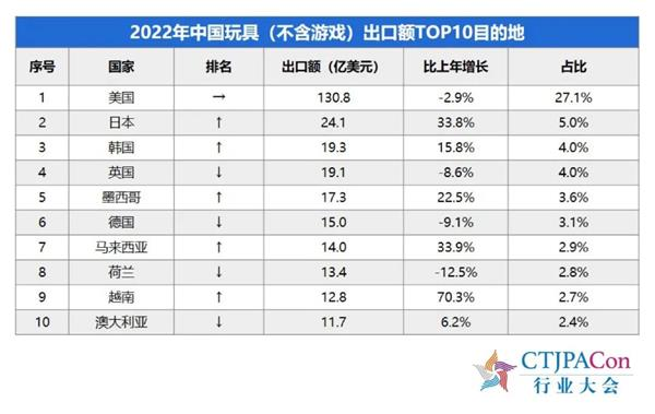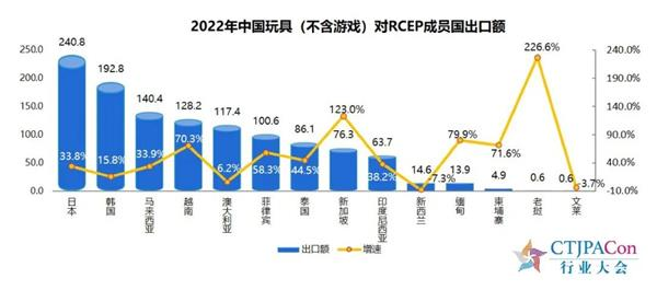 2022年,中国玩具(不含游戏)出口额为483.6亿美元,比上年增长5.6%;中国玩具(不含游戏)出口额TOP10目的地,日本从第三升至第二,比上年增长33.8%;中国玩具(不含游戏)对RCEP成员国出口额为118.1亿美元,比上年增长36.1%。