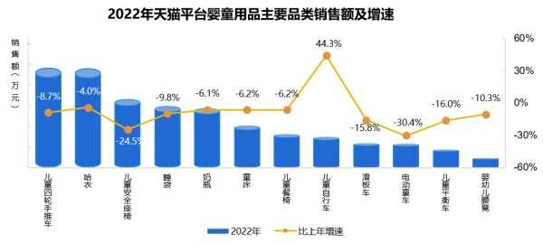婴童用品,儿童自行车销售额比上年增幅最大,为44.3%。