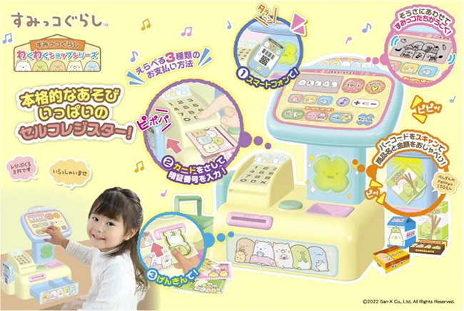 日本玩具奖的“基础玩具”部门主要面向促进五感潜能开发的玩具,包括玩偶、过家家、手工DIY等类别。今年获得该部门金奖的产品结合在日本深受欢迎的热门IP角落小伙伴,模拟超市自助收银操作,配备三种付款方式:刷卡、现金或扫描二维码,带给儿童更多场景和趣味的游戏体验。